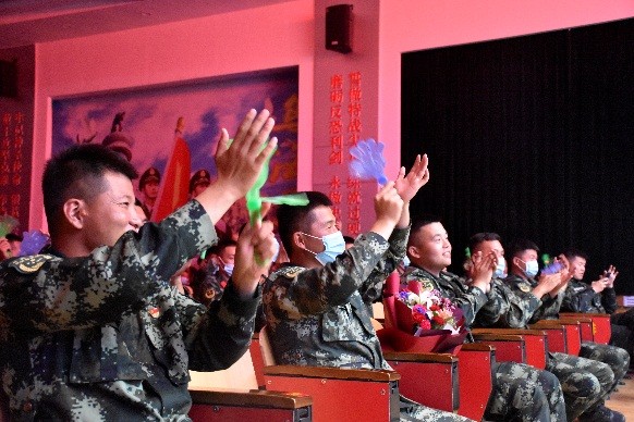 歌曲《亲爱的人》《当兵的味道》《我的未来不是梦》《当那一天来临》动人的旋律一次次点燃全场官兵的激情,他们还走下舞台和官兵们亲切互动,欢呼声掌声真挚热烈,开心和幸福绽放在官兵的脸庞上。