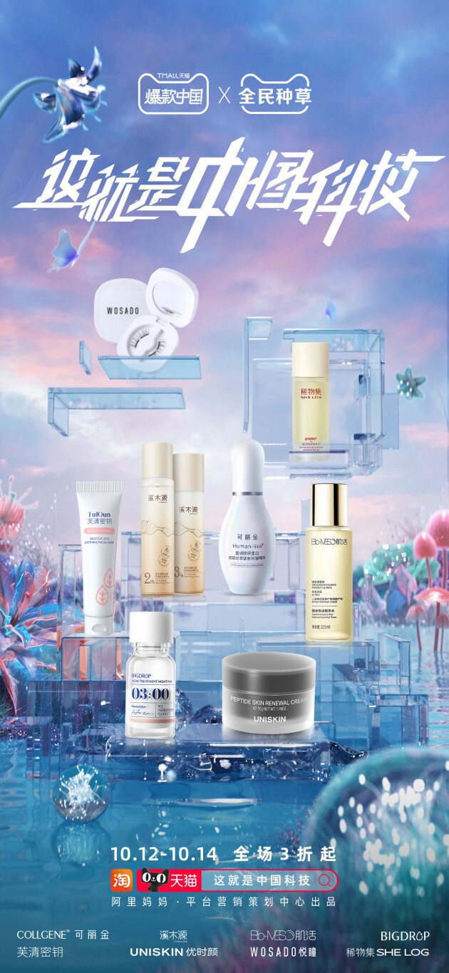 为此,天猫联合央视网,携BIG DROP大水滴、芙清密钥、Bio-MESO肌活、可丽金、稀物集、溪木源、优时颜、悦瞳八大国货品牌,共同打造“这就是中国科技”活动。