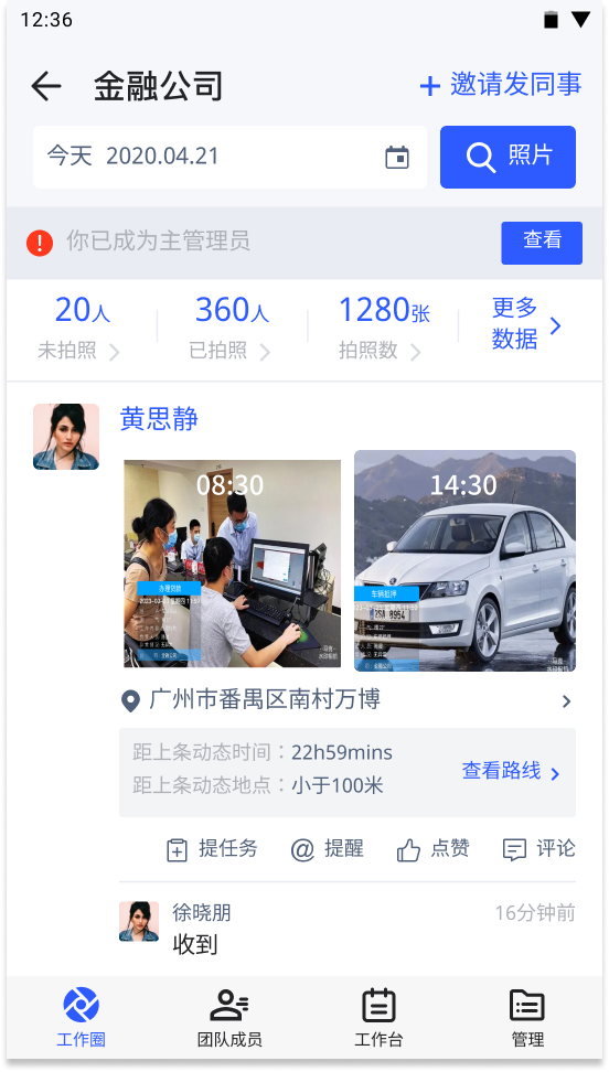 在日常工作中,经常要拍照报备自己的工作情况,但是人数太多照片容易丢失或查找不便,工作汇报成为员工负担,对此,马克水印相机的团队工作圈可以有效解决这类工作汇报问题。只需要使用马克水印相机拍照,照片就会自动实时同步到工作圈,并且这些照片会自动分析成各种数据,照片都可以存储到团队的相册内,为日后工作的留存留证,追溯工作的源头留下影像。