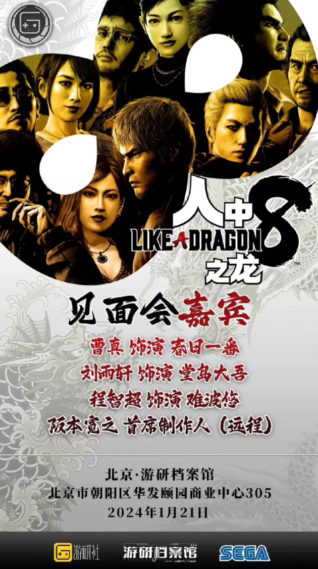 由游研社和世嘉联合举办,《人中之龙8》将于1月20日(周六)、1月21日(周日)连续两天在北京游研档案馆举办《人中之龙8》线下试玩会、声优&制作人见面会。